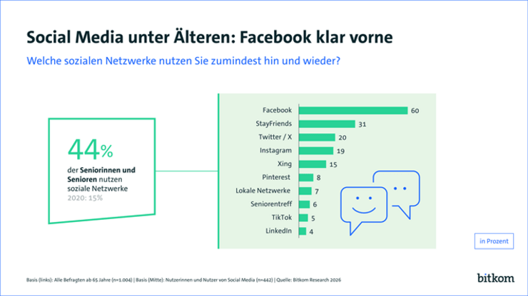 Neues aus der Welt oder der Region erfahren, Kontakt zu alten Freunden halten oder neue finden, Anregungen zu Hobbys sammeln oder selbst etwas posten – immer mehr ältere Menschen entdecken die Möglichkeiten sozialer Netzwerke für sich. Inzwischen nutzen 44 Prozent der Seniorinnen und Senioren ab 65 Jahren Facebook, Instagram und Co. Vor fünf Jahren waren es erst 15 Prozent. Dies sind Ergebnisse einer repräsentativen Befragung von 1.004 Personen ab 65 Jahren in Deutschland im Auftrag des Digitalverbands Bitkom.