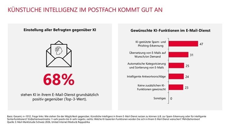 Offen für KI: Mehr als zwei Drittel der Schweizerinnen und Schweizer stehen KI im E-Mail-Postfach grundsätzlich positiv gegenüber. Zu diesen Ergebnissen kommt das Forschungsinstitut Reppublika in der aktuellen E-Mail-Marktstudie Schweiz. Hierfür wurden 1.012 Onliner in der deutschsprachigen Schweiz ab 16 Jahren befragt. Insbesondere bei den jüngeren Befragten zeigt sich eine besondere Dynamik bei der E-Mail-Nutzung.