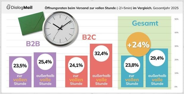 Wenn Sie ein Mailing nicht zur vollen Stunde verschicken, erzielen Sie im Durchschnitt eine wesentlich höhere Öffnungsrate: 29,4% gegenüber 23,8%!